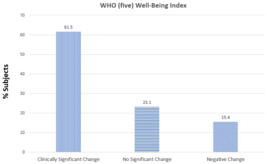WHO (five) well-being index: Of the 13 subjects, 8 (61.5%) had a clinically significant positive change, 2 (15.4%) had no change and 2 (15.4%) showed a negative change in score as compared to baseline (Figure 1)