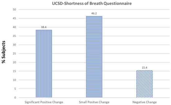 University of California San Diego Shortness of Breath (UCSD-SOB): Of the 13 subjects, 5 (38.4%) showed a positive significant change, 6 (46.2%) showed a small positive change that was not considered a reasonable MCID, and 2 (15.4%) showed a negative change in score as compared to baseline (Figure 2).