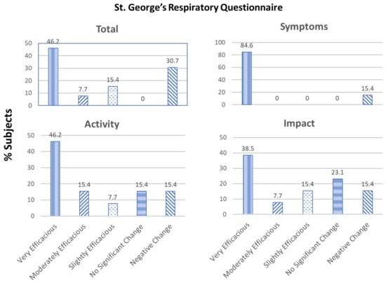 St. George’s Respiratory Questionnaire (SGRQ): Of the 13 subjects, the treatment was found to be very efficacious in 6 (46.2%), moderately efficacious in 1 (7.7%), and slightly efficacious in 2 (15.4). Four (30.7%) subjects showed a decline in their total SGRQ scores. SGRQ scores were also calculated for the following three domains: Symptoms, Activity, and Impacts (Figure 3).