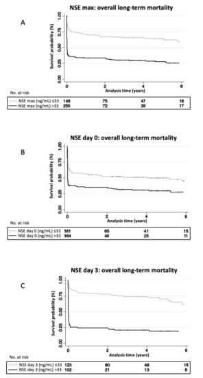 NSE levels associated with overall long-term mortality: Kaplan-Meier curves stratified by serum NSE-concentrations above and below 33ng/mL using maximal NSE measured (A), measured on day 0 (B) and measured on day 3 (C). Log-Rank Test of NSE max p < 0.001; Log-Rank Test of NSE day 0 p < 0.001; Log-Rank Test of NSE day 3 p < 0.001. NSE, neuron specific enolase.