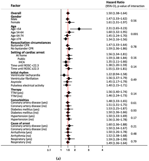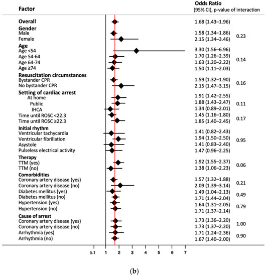 (a) Subgroup analysis of NSE levels on day three for endpoint overall long-term mortality. Data presented as hazard ratio (95% confidence interval); CPR, cardiopulmonary resuscitation; IHCA, in-hospital cardiac arrest; ROSC, return of spontaneous circulation; TTM, targeted temperature management. (b) Subgroup analysis of NSE levels on day three for endpoint neurological outcome after 2 years. Data presented as odds ratio (95% confidence interval); CPR, cardiopulmonary resuscitation; IHCA, in-hospital cardiac arrest; ROSC, return of spontaneous circulation; TTM, targeted temperature management.