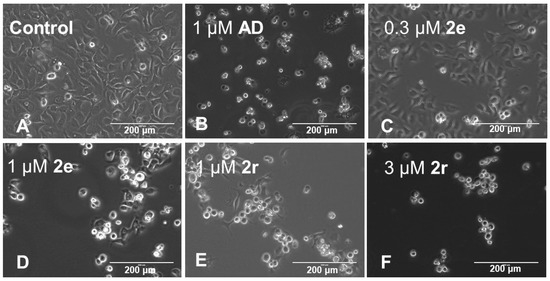 Both 2e and 2r caused the mitotic arrest; i.e., the compounds inhibited various stages of mitosis and cell division. In contrast, a reference drug actinomycin D (AD) induced apoptotic bodies. These results are indicated in Figure 4.