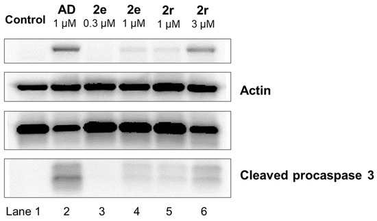 A Western blot analysis was undertaken, and the results are presented in Figure 5. The enzyme poly(ADP-ribose)polymerase 1 (PARP 1) assists with the repair of damaged DNA. Thus, compounds which cleave PARP1 may be useful in cancer chemotherapy. As indicated in Figure 5, at a concentration of 3 µM, 2r causes cleavage of PARP. Procaspase 3 is a precursor of caspase 3, and both of these enzymes are overexpressed in some tumours [32]. Hence reduction in the concentration of procaspase 3 and a rise in cleaved caspase 3 are useful properties for a candidate anticancer agent to demonstrate. At a concentration of 3 µM, 2r causes a reduction in the concentration of procaspase 3 and, along with a concentration of 1 µM of 2e and 2r, shows procaspase 3 has been cleaved.