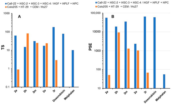 Comparison of SI and PSE values of 3,5-bis(benzylidene)-4-piperidones against OSCC (A) and colon and lymphoid leukemia cell lines (B). The SI and PSE values are derived from Table 1, Table 2 and Table 4. The cytotoxicity data of doxorubicin and melphalan against colon and lymphoid leukemia cell lines are not available.