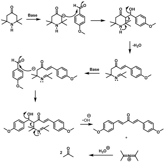 There is a lack of coplanarity between the aryl rings and the adjacent olefinic groups. These interplanar angles θ are created between two carbon atoms of the aryl rings and the olefinic groups. These θ values are caused by non-bonded interactions between the ortho protons of the aryl ring and the equatorial hydrogen atom at locations 2 and 6 of the piperidine ring [33]. Hence, by replacing the protons at positions 2 and 6 of the piperidine ring with methyl groups, substantial increases in the sizes of the theta values may occur. The cytotoxic potencies of such compounds could be compared with the analogs in series 2, which have the same aryl substituents. However, there was no reaction between 4-methoxybenzaldehyde and 2,2,6,6-tetramethyl-4-piperidone when the acid catalyzation method employed in preparing series 2 was used. Under basic conditions using sodium ethoxide or sodium methoxide, a product was isolated, which was identified as 1,5-bis(4-methoxyphenyl)-1,4-pentadien-3-one 3a. A possible way in which this reaction takes place is presented in Scheme 1. In order to explore the generality of this reaction, the unsubstituted, 4-chloro and 4-fluoro analogs of 3a (Figure 3)were prepared in yields of 22% to 41%. In the future, acylation of the piperidyl nitrogen atom of 2,2,6,6-tetramethyl-4-piperidone prior to attempted reactions with aryl aldehydes may lead to the formation of the desired products, since this molecular modification may prevent the opening of the piperidine ring.