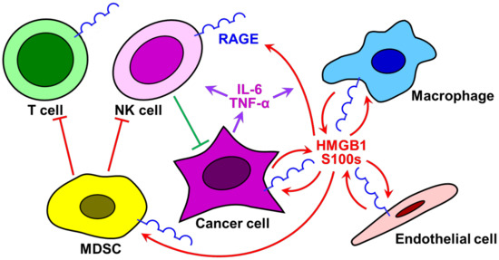 A high correlation between chronic inflammation and carcinogenesis has been apparent from epidemiological and cellular-molecular analyses [1,2,3,4,5,6,7,8]. Various types of inflammation- and immune-related cells, such as macrophages, endothelial cells, natural killer (NK) cells, T cells, and myeloid-derived suppressor cells (MDSCs), join in a tumor and generate an inflammatory tumor microenvironment (TME) that impairs anti-cancer immunity and T cell tolerance and promotes cell proliferation, anti-apoptosis, survival, invasion, and metastasis (Figure 1). In particular, macrophages and MDSCs enter the cancer mass as the primary players in the inflammatory milieu of cancer [8,9,10,11,12]. The establishment of the TME depends on the activation of certain transcription factors, including nuclear factor-κB (NF-κB) and hypoxia-inducible factor-1α (HIF-1α), in cancer cells [13,14,15,16,17,18]. These transcription factors up-regulate the expression of inflammatory cytokines, such as interleukin-6 (IL-6) and tumor necrosis factor-α (TNF-α) [19,20,21,22]. These cytokines trigger the activation of inflammation as autocrines and paracrines, resulting in the release of pro-inflammatory mediators, such as high mobility group box 1 (HMGB1) and S100 family proteins (S100s), from macrophages and endothelial cells. These molecules, in turn, activate the receptor for advanced the glycation end-products (RAGE)-mediated signaling pathway and enhance inflammation in vicious feed-forward loops [23,24,25,26] (Figure 1). Subsequently, these RAGE ligands have been suggested to be involved in the establishment of TEM and become signals to activate carcinogenesis. However, the exact molecular and cellular mechanisms by which the HMGB1-RAGE signaling pathway participates in the establishment and maintenance of an inflammatory TEM, and consequently promotes carcinogenesis, remain to be solved.