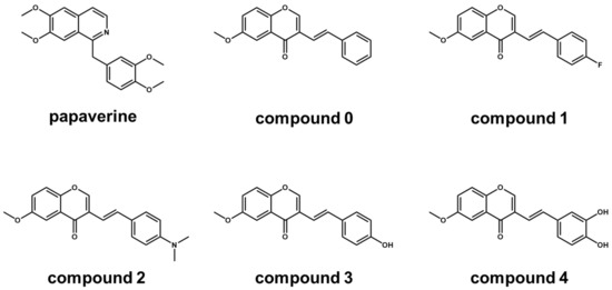 (E)-6-methoxy-3-styryl-4H-chromen-4-one (compound 0, 6M3SC), (E)-3-(4-fluorostyryl)-6-methoxy-4H-chromen-4-one (compound 1), (E)-3-(4-(dimethylamino)styryl)-6-methoxy-4H-chromen-4-one (compound 2), (E)-3-(4-(hydroxyl)styryl)-6-methoxy-4H-chromen-4-one (compound 3), and (E)-3-(3,4-(hydroxyl)styryl)-6-methoxy-4H-chromen-4-one (compound 4) (Figure 2) were synthesized by Knoevenagel condensation of the appropriate 3-formylchromone with selected phenylacetic acid derivatives, as described previously [42,44]. All the compounds were characterized by 1H NMR, MS spectra and elemental analyses after purification by silica gel column chromatography and recrystallization. All the compounds were dissolved in DMSO at 80 mM and stored at –20 °C before use.