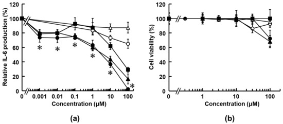 Anti-inflammatory activities of 6M3SC derivatives in HMGB1-stimulated RAW264.7 cells. (a) The cells were treated with indicated concentrations of each compound: 0 (open circle), 1 (open triangle), 2 (closed square), 3 (closed circle), and 4 (closed triangle). The IL-6 production (% of control) was measured using the IL-6 ELISA system, as described in the Materials and Methods section. Values are mean ± standard error (SE) for four independent experiments, and the bars indicate the SE values. (b) Cell viability was determined by the WST-8 assay, as described in the Material and Methods section. The data are presented as mean ± SE of four independent experiments and * p < 0.05 was accepted as a significant difference compared with untreated samples for compound 3.