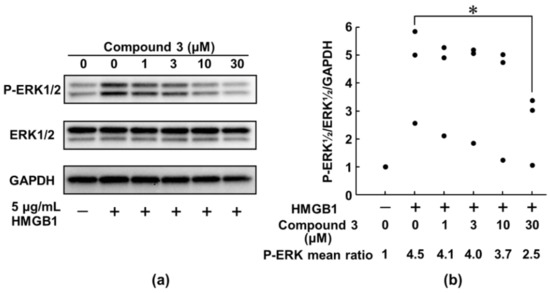 Suppressive effect of compound 3 on the HMGB1-induced activation of ERK 1/2. RAW264.7 cells were pretreated with compound 3 at the indicated concentrations for 2 h and then stimulated with HMGB1 (5 μg/mL) for 18 h. Cell lysates were subjected to Western blotting using phospho-ERK 1/2 (P-ERK 1/2) and total ERK 1/2 antibodies as described in the Materials and Methods section. GAPDH served as a loading control. The panels depicted a typical immunoblot (a) and values presented as mean ratio of three independent experiments of each P-ERK 1/2, ERK 1/2, and GAPDH band intensities were calculated by densitometric analysis (b). * p < 0.05 was accepted as a significant difference.