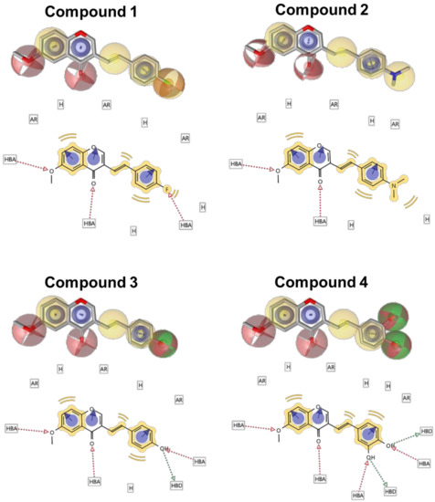 The aforementioned observations indicated that the substituents at the para-position were electrostatically important in the anti-inflammatory and anti-cancer activities. As such, the four compounds were evaluated to gain further insight into the effects of the substituents. The 3D pharmacophore analyses by LigandScout are useful tools to characterize the 3D electrostatic features of small molecules (Figure 5). As summarized in Table 2, the apparent differences between the four compounds are the numbers of hydrophobic regions (H), hydrogen bond acceptors (HBA), and donors (HBD). All compounds have the same aromatic regions. Compounds 3 and 4 contain a hydrogen bond donor at the para-position of the 3-styryl moiety. Compound 4 had a more hydroxyl group at the meta-position and less anti-inflammatory activity as compared with compound 3 (Figure 3a). On the other hand, when the hydroxyl group of compound 3 was substituted for the hydrophobic dimethylamino group (compound 2), the anti-inflammatory activity was considerably lower (Figure 3a).