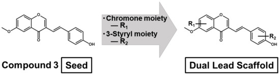 As compound 3, whose C4′ position is the hydroxyl group, had the highest anti-cancer activity (Table 1), the functional hydroxyl group at the para-position of the benzene ring in the 3-styryl moiety may be necessary to donate anti-cancer activity to the 6M3SC. In contrast, the hydrophobic dimethylamino group (compound 2) was revealed to be more beneficial for anti-cancer activity than the di-hydroxyl group (compound 4) (Table 1). These results suggest that the structural improvements and optimization of the para-position of the benzene ring in the 3-styryl moiety may be important to generate a new type of anti-cancer agent that possesses potent anti-inflammatory activity. Furthermore, additional structural improvements to compound 3, via the attachment of appropriate side chains at the proximate meta-/para-positions of the chromone moiety and meta-/ortho-positions of the 3-styryl moiety, might increase both anti-cancer and anti-inflammatory activities and ameliorate the issue. As such, a new dual anti-cancer scaffold with substituents at these positions should be designed from the seed structure of compound 3 (Figure 6).