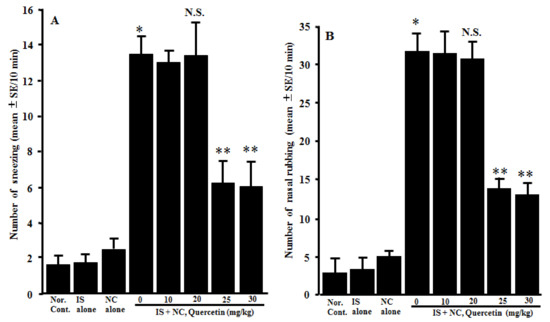 - Kashiwabara, M.; Asano, K.; Mizuyoshi, T.; Kobayashi, H. Suppression of neuropeptide production by quercetin in allergic rhinitis model rats. BMC Complement Altern. Med. 2016, 16, 132. [Google Scholar] [CrossRef]