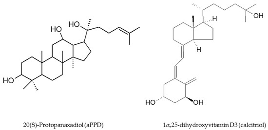 Chemical structures of 20(S)-Protopanaxadiol (aPPD) and 1α,25-dihydroxyvitamin D3 (calcitriol).