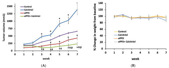The antitumor effects of aPPD either alone or in combination with calcitriol on the tumor volume of C4-2 mice xenograft (A) and body weight (B). Change in tumor volume was followed over time for mice treated orally with either the control (ethanol: propylene glycol: water at 2:7:1) or aPPD (70 mg/kg once daily) or a combination of aPPD and calcitriol (4 µg/kg three times weekly) formulation. In vivo toxicity as assessed by the decrease in mean body weight of C4-2 mice xenograft. No animals showed any signs of toxicity or weight loss. Data are presented as Mean ± SEM (n = 8). A p value < 0.05 was considered significant when compared to vehicle control (*) or calcitriol-treated group (#) or aPPD-treated group (@).