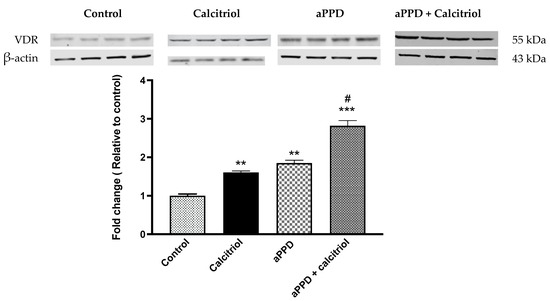 The relative quantification of VDR protein to beta actin shows that calcitriol or aPPD increased VDR protein levels by approximately 2-fold in C4-2 tumors (p < 0.001) than when compared to the control group, while substantial additional increases in VDR expression were observed when calcitriol was added to aPPD (p < 0.05). (Figure 3).