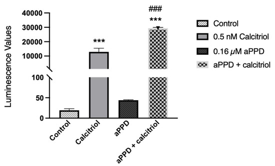 VDR transactivation following calcitriol (0.5 nM), aPPD (0.16 µM), or in combination in the reporter cells. Data are expressed as luminescence values following treatment and normalized to the blank assay kit as instructed by the manufacturer. The results represent the mean ± SEM of three independent experiments. A p value < 0.001 was considered an extremely significant (*** or ###) change compared to the media control (*) or calcitriol or aPPD-only treated group (#).