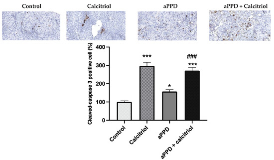 Immunohistochemistry staining of tumors derived from C4-2 xenografts. Apoptosis marker cleaved caspase-3 in the tumors. C4-2 cell xenograft tumors were excised after 46 days of treatments with aPPD and aPPD and calcitriol combination or control. Data are presented as Mean ± SEM (n = 4). A p value < 0.05 was considered significant (*) and a p value < 0.001 was considered an extremely significant (*** or ###) change compared to vehicle control (*) or to aPPD treated group (#).