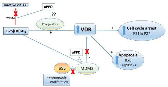 The VDR-mediated antitumor effects can be achieved through several downstream mechanisms including pro-apoptotic, cell cycle arrest, and anti-proliferative pathways (Figure 7). In prostate and other cancer types, several VDR-modulated genes can regulate the cancer development and progression. However, caspase-3 levels were similar in calcitriol-only group and combination group with opposing antitumor effects. It is critical to recognize that higher levels of caspase-3 do not guarantee antitumor effects or vice versa and, in contrast, depending on the tumor type and its complex microenvironment caspase-3 may play non-apoptotic roles in crucial tumorigenesis processes including cell proliferation, migration, or invasion [62]. Huang et al. (2011) reported that apoptotic tumor cells stimulate the repopulation of tumors from a small number of surviving cells [63]. Higher levels of caspase-3 in tumors were correlated with significantly stimulated tumor cell proliferation in vivo via compensatory proliferation for tissue regeneration mediated by prostaglandin E3 [63]. Similarly, Donato et al. (2014) reported that caspase-3 in dying melanoma cells significantly stimulated the growth of living melanoma cells in vitro and in vivo [64]. Calcitriol demonstrated antitumor effects in combination with CYP24A1 inhibitors in PC-3 prostate xenograft mouse in caspase-3-independent apoptosis pathways [49]. Additional reports suggest that caspase-3 is simply one of the many cell death or antiproliferative pathways that can facilitate antitumor effects of calcitriol in a tumor-dependent manner [65,66,67]. Indeed, we have previously shown in vitro that aPPD and calcitriol combination accomplishes the anticancer effects in androgen-dependent non-metastatic LNCaP and androgen-independent metastatic C4-2 cells through a variety of apoptotic and cell cycle pathways. The combination treatment increased the expression of pro-apoptotic Bax and amplifies the anti-apoptotic Bcl2 inhibition. Similarly, the combination was able to block the cdk2 cell cycle protein [21]. In certain cases, cells treated with aPPD alone demonstrated higher apoptotic and cell cycle protein expression than the calcitriol-alone group [21]. We postulate that the aPPD and calcitriol combination facilitates the antitumor action in the C4-2 human prostate cell xenograft model through non-caspase-3 mediated apoptosis (e.g., Bcl2, Bax) and cell cycle control (e.g., cyclin D1, cdk2, P21, and P27) pathways of VDR-mediated downstream effects. It is also plausible that both aPPD and calcitriol interacts through the mouse double minute-2 (MDM2) pathway [68,69]. MDM2 protein can strongly downregulate p53, which is a major tumor suppressor gene [70], and can also negatively affect VDR and its downstream functions [71]. Both aPPD and calcitriol can antagonize MDM2 protein, which can eventually lead to improved anticancer outcome through enhanced p53 and VDR functions (Figure 7).