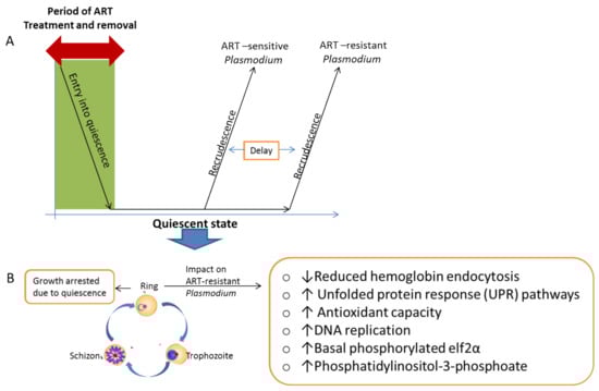 Resistance development selection due to artemisinin drug pressure. The drug pressures lead to the selection of resistant parasite phenotypes conferred by gene mutations that can be passed on to the next generations. (A) The impact of ART exposure on ART-sensitive and ART-resistant Plasmodium, where a subpopulation goes into quiescence and recrudesces when the ART is removed, where there is a delay in the recrudescence of the resistant strains. (B) Characteristics of the quiescence-based artemisinin resistance. ART = artemisinin.