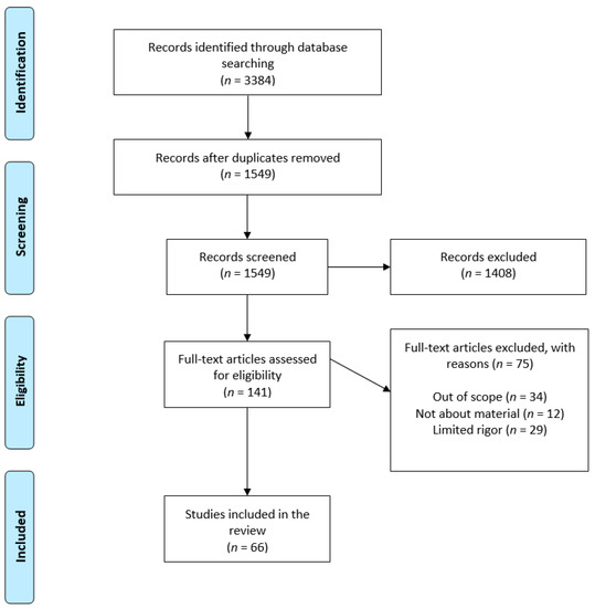 All obtained studies were exported to Endnote software and were verified to remove duplicates. Authors independently screened the search results and identified studies that were potentially relevant based on title and abstract. Relevant studies were read in full and selected according to inclusion criteria. The search conducted in different electronic databases identified 3384 articles. A total of 1549 articles were short-listed after the removal of duplicates. After screening titles and abstracts, 141 studies were assessed for eligibility and 66 studies were included in the narrative review. The detail of the search is presented as PRISMA chart in Figure 1.