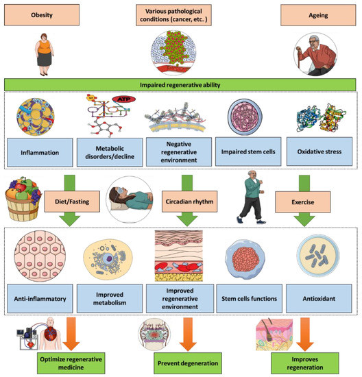 Exercise is prescribed in obesity and ageing for reasons initially independent from regeneration (weight and adiposity loss, muscle function improvement, etc.). However, the above examples clearly reflect how exercise would be important for regeneration, including in the contexts of obesity and ageing. Exercise would both improve regeneration and reduce the negative impacts that obesity and ageing have on regeneration. The dietary choices and sleeping patterns described above would also contribute to reduce the impacts of obesity and ageing as well. Therefore, indirectly improve the biological regeneration ability. Importantly, targeting regeneration-related pathways in both obesity and ageing represents an additional shared pattern between obesity and ageing.