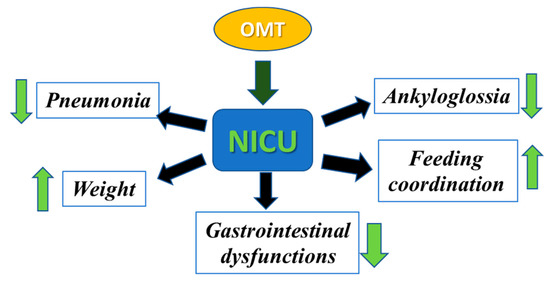 Following delivery, several factors contribute to the need for extended length of stay (LOS) in the NICU [31,32]. Historically, the population requiring most NICU admissions is preterm births, defined as a delivery prior to 37 weeks of gestation. Approximately 10% of all births require admission to the NICU, secondary to premature birth [33]. This results in a disproportionate amount of overall NICU cost that is associated with preterm care. A major concern of both term and preterm infants in the NICU is difficulty with breastfeeding and maintenance of the infant’s growth after discharge [34,35]. Furthermore, in the current era of increasing nosocomial infection, both term and preterm infants admitted to the NICU are particularly vulnerable to respiratory and gastrointestinal infections [36,37,38]. Therefore, there is a need for alternative, safe treatment options that have demonstrated promise in significantly reducing the need for hospitalization and LOS in the NICU. In this respect, OMT has often been found to be effective in combating prolonged hospital stays in infants [39,40,41,42,43]. In the following sections, we present findings from several NICU clinics around the world that show the significant efficacy of OMT in reducing infant morbidity and mortality (Figure 2).