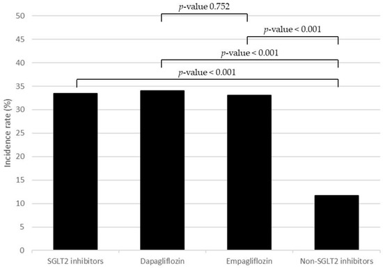 Figure 1. The incidence rate of UTI compared between SGLT2 inhibitors, dapagliflozin, empagliflozin, and non-SGLT2 inhibitors.
