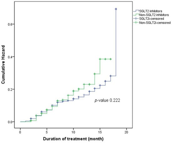 Regarding the time of UTI events, the mean time to UTI event of patients in the SGLT2 inhibitor group was 15.92 months, and that of patients in the non-SGLT2 inhibitor group was 14.69 months. The Kaplan-Meier curve in Figure 2 shows the cumulative incidence of the patients in both groups, and the Log-rank test indicated no significant difference among them (p-value 0.222).