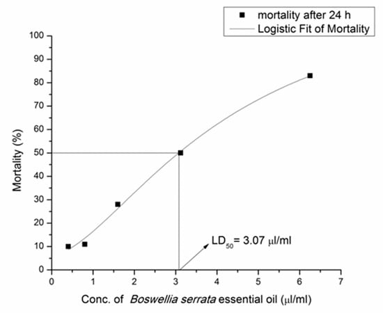 Relationship between mortality (%) and B. serrata EO concentration (µL/mL) after 24 h. Mortality after 24 h (■), logistic Fit of Mortality (–––) and LD50 = 3.07 µL/mL.
