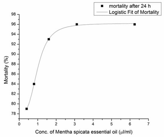 Relationship between mortality (%) and M. piperita EO concentration (µL/mL) after 24 h. Mortality after 24 h (■) and logistic Fit of Mortality (–––).