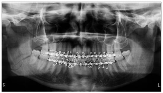 Orthopantomography of a patient with a fracture on the right angle of the mandible; bimaxillary immobilized exemplifies an improper adjustment in the focal through due to the absence of the bite-block, resulting in a blurry contour of the teeth, more obvious in the frontal region. Additionally, the image shows a head position in extension and incorrect exposure factors.