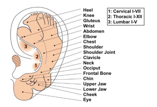 - Oleson, T. Auricolotherapy Manual: Chinese and Western Systems of Ear Acupuncture, 3rd ed.; Churchill Livingstone: London, UK, 2003. [Google Scholar]
