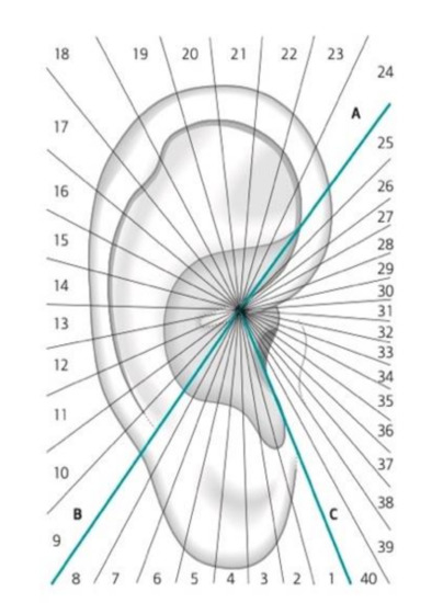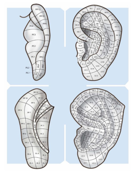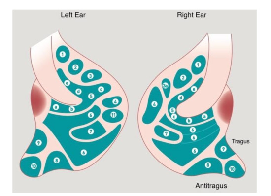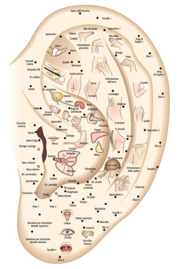 - Nogier, P.F.M.; Bourdiol, R.J.; Bahr, F. Loci auriculomedicinae. Maissonneve 1975. Available online: https://scholar.google.com/scholar_lookup?title=Loci+Auriculomedicinae&author=P.+F.+M.+Nogier&author=R.+J.+Bourdiol&author=F.+Bahr& (accessed on 13 November 2020).