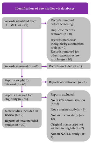 Literature searches were conducted using the PubMed database to gather research articles involving EGCG or GTE use in humans and rodent models. The literature search was conducted on 16 December 2021, using the following search string for murine studies: (EGCG) AND (fatty liver OR NAFLD). The following search string was used for the human studies: (EGCG) AND (fatty liver OR NAFLD) AND (human studies). A total of 77 rodent studies and 22 human studies were retrieved from these searches. Additional human studies were identified by performing a Google search and by manually searching the reference lists of review articles, as indicated in Figure 1 and Figure 2. The article inclusion and data reporting were independently performed by one author, with no automation tools used during the process. PRISMA diagrams for both murine and human studies were constructed in accordance with the updated PRISMA 2020 guidelines. The inclusion criteria for the animal and human studies included the following: original articles must be written in English; a quantifiable dose of EGCG or GTE must be reported; studies must have sufficient study duration; in vivo studies are required; NAFLD must be induced in animal studies; and changes in clinical phenotypes must be reported. The PRISMA diagrams shown in Figure 1 and Figure 2 detail the search processes and final number of studies included in this systematic review (30 murine studies and 21 human studies).
