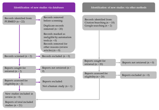 PRISMA flow chart for human studies indicating how the 21 studies were chosen.