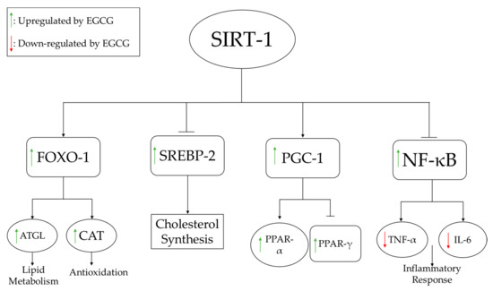 - Li, Y.; Wu, S. Epigallocatechin gallate suppresses hepatic cholesterol synthesis by targeting SREBP-2 through SIRT1/FOXO1 signaling pathway. Mol. Cell. Biochem. 2018, 448, 175–185. [Google Scholar] [CrossRef]