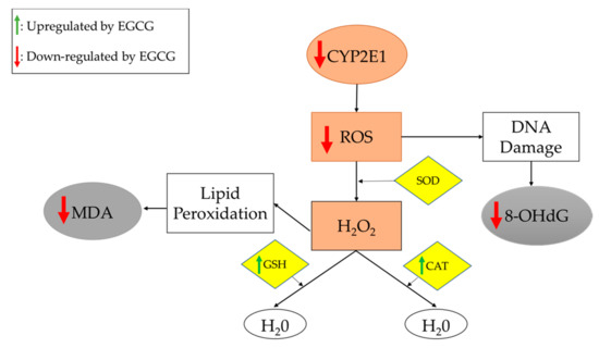 Kuzu et al. examined the effects of EGCG on oxidative stress associated with the CYP2E1 enzyme. These authors concluded that EGCG potentially suppresses CYP2E1-associated oxidative stress, as it decreases lipid peroxidation and increases GSH levels [11]. As shown in Figure 4, EGCG treatment reduces the expression of CYP2E1, leading to decreased synthesis of ROS (which damage DNA) and increased expression of antioxidants, which alleviate oxidative stress.