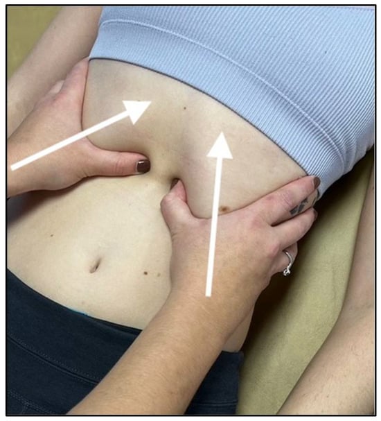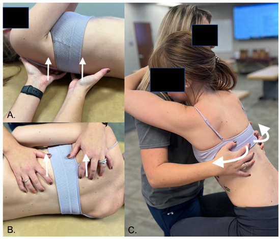 The rib raising technique is performed with the patient in a supine or seated position, and the physician sits on the side of the patient with their fingertips contacting the ipsilateral rib angles (Figure 6). The physician will use a slow and gentle rocking motion to lift the rib angles anteriorly and then release the tension [43]. The physician will work their way along the thorax until the technique has been done on each rib angle multiple times, ensuring this technique is also done bilaterally [43,44]. Indeed, there have been a variety of modifications made to this technique [45,55]. The physician will typically feel the muscle tension and motion restrictions decrease as the technique is performed on the patient. Rocha et al. (2020) [55] carried out a pilot study to measure the effects of rib mobilization and diaphragm release on cardiac autonomic control in patients with COPD. It was documented that the majority of patients reported significant symptom improvement.