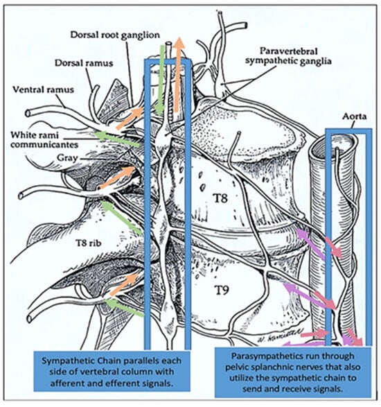 Sympathetic chain ganglionic pathway. The bilaterally symmetric sympathetic chain ganglia are located just ventral and lateral to the spinal cord and run parallel with the thoracic spine. The sympathetic chain ganglionic pathway extends from the upper neck down to the coccyx, forming the cervical, thoracic, lumbar, or sacral ganglions. The postganglionic fiber extends to the thoracic cavity, abdominal cavity, or pelvic cavity, and dysfunctions in many organs can be addressed by different variations of the rib raising techniques. Adapted from Karemaker et al. (2017) [45]. The eighth and the ninth thoracic vertebrae are designated as T8 and T9, respectively. The eighth and ninth thoracic spinal nerves run beneath these vertebrae. The green arrows designate afferent neurons and the brown arrows designate the efferent neurons.