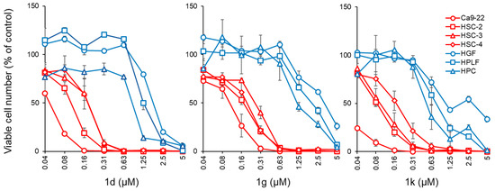 Kinetics of cytotoxicity induction by 1d, 1g, and 1k on human oral squamous cell lines (Ca9-22, HSC-2, HSC-3, and HSC-4) and human normal oral cells (HGF, HPLF, and HPC). These cells were incubated for 48 h with the indicated concentrations of 1d, 1g, and 1k, and the viable cell number was determined by MTT [3-(4,5-dimethylthiazol-2-yl)-2,5-diphenyltetrazolium bromide] methods. Each value represents the mean ± S.D. (standard deviation) of triplicate assays.