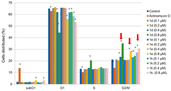 The first experiment was designed to assess whether representative compounds in series 1 interfered with the cell cycle. The three compounds with the lowest CC50 values towards Ca9-22 cells were 1d,e,k. Four concentrations of each compound were used. The data generated are presented in Figure 3. Concentrations of 0.1, 0.2, and 0.4 µM of 1d,e,k had little effects on the cell cycle, but at the highest concentration of 0.8 µM, a significant effect was noted (p < 0.05), and the most prominent increase of G2M cell population occurred with the three compounds (indicated by red arrows). Only a slight increase of the subG1 population occurred by 1e and 1k at 0.8 µM, but much lower than that was achieved by actinomycin D (1 µM) (Figure 3).