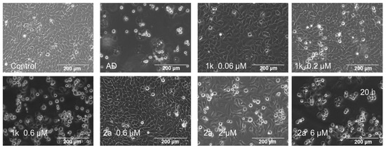 The effect of 1d,e,k on the cell cycle in Ca9-22 cells. Cells were treated without (control) or with 1 μM actinomycin D (AD) or the indicated concentrations of 1d, 1e, and 1k in the presence of the DMSO vehicle (0.1%). Experimental data are presented as the mean ± standard deviation (SD) of triplicate determinations. The significance of values was examined by one-way analysis of variance (ANOVA) and appropriate Dunnett’s post-test. A value of * p < 0.05 was considered to indicate statistically significant differences. The red arrows indicate the highest value of G2/M phase cells in 1d, 1e and 1k.