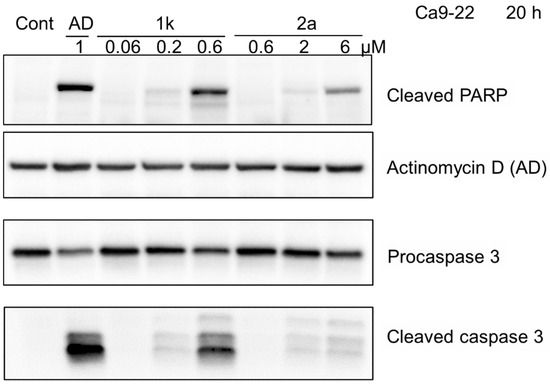 Cleavage of PARP and procaspase 3 in Ca9-22 cells by 1k, 2a, and actinomycin D(AD). Cells were treated without (control) or with 1 μM actinomycin D or the indicated concentrations of 1k and 2a in the presence of the DMSO vehicle (0.1%).