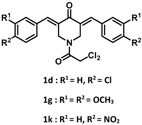 The synthesis of series 1 and 2 followed a literature procedure [2]. Various aryl aldehydes were reacted with 4-piperidone to produce the corresponding 3,5-bis(benzylidene)-4-piperidones. Acylation of these intermediate unsaturated ketones with dichloroacetyl chloride gave rise to the desired products 1a–l. Acylation of 3,5-bis(benzylidene)-4-piperidone 2a with acetyl chloride led to the formation of 2b. The structures of the compounds in series 1 and 2 are portrayed in Figure 1.