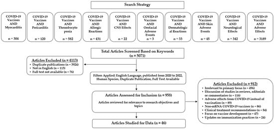 Our study selection strategy is shown in Figure 1. Articles retrieved based on a search with pre-specified keywords were initially screened for eligibility by applying the following inclusion criteria: (i) published from 2020 to 2022, (ii) in English, and (iii) full text available. Duplicate publications were excluded. A second screening process excluded full-text articles that were not directly relevant to our research objectives and topics (e.g., articles with a focus on adverse effects of COVID-19 infection, vaccine development, non-mRNA COVID-19 vaccines, or clinical treatment recommendations). Only peer-reviewed studies reporting adverse events following immunization with one of the novel mRNA-based COVID-19 vaccines were included. Two reviewers independently searched the literature, applied screening filters, and evaluated each article’s eligibility for inclusion based on the predefined criteria. Three additional reviewers supervised the study selection process.