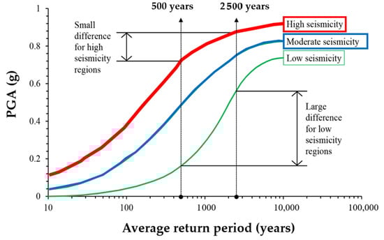 PGA-return period correlation with reference to low-, moderate-, and high-seismicity regions [].