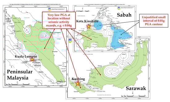 The requirement of a minimum seismic hazard design factor (Z, known as the effective PGA) of 0.08 for a return period of 500 years was implemented in the 2018 revision to the Australian Standard for seismic actions []. Thus, in most parts of Australia Z = 0.08 is specified in the new seismic hazard map, superseding an old model derived originally from conventional PSHA (based on information from documented historical seismic activities). In contrast to the new stipulation, the value of Z in the old map could be as low as 0.03 for areas where no historical activities had been recorded within the period of seismic activity observation. However, unlike the Australian Standard [], recommendations in the draft Malaysia NA [] for imposing a minimum seismic loading of 0.07 g and 0.12 g to different parts of Malaysia have not been taken up by the enacted version of the Malaysia NA to EC8 [], which was completed through a decision process based on voting. One of the consequences of the decision is that an unacceptably low agR value of 0.04 g has been stipulated for Kota Kinabalu (the capital city of Sabah), which was only some 50 km from the epicentre of the M5.9 Ranau earthquake of 2015 (see Figure 3). In addition, given that the modelling has not been subject to any independent audit by a third party, the modeller did not have to abide by any rules nor any form of control. A small interval of 0.01 g PGA contour was created (as shown in Figure 3) even when such a high-resolution seismic hazard map cannot be justified (given that seismic data has only been recorded from one earthquake event).