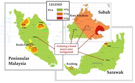 On recommendations made by WG1 in the draft Malaysia NA to EC8 for public comments [], a minimum level of the reference peak ground acceleration (PGA) on rock (agR) of 0.07 g was considered to be specified for Peninsular Malaysia and Sarawak and 0.12 g for most of Sabah. The recommended minimum hazard requirements can be justified by referring to results from PSHA, assuming a uniform spatial distribution of seismic activities and observations on the frequency of occurrence of M > 5 earthquake events over an extensive area []. The agR value of 0.07 g and 0.12 g, as quoted above for a notional return period of 500 years, was two-thirds of the values (0.10 g and 0.18 g, respectively), corresponding to a return period of 2500 years, i.e., MCE []. The modelling concept as described is likened to that of background seismicity (which is a well-established concept). However, background seismicity models that have been employed in the past for PSHA did not prevent the value of agR to go as low as 0.03 g for a design return period of 500 years.