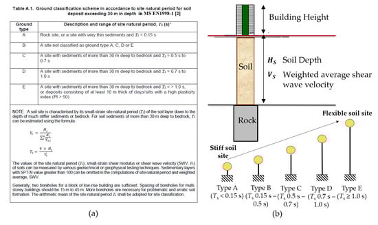 Solution to circumvent Challenge 2 with a new site classification scheme. (a) Definition for Model B from the Malaysia NA to EC8 []. (b) Analogy of stiff soil and flexible soil sites according to single-degree-of-freedom lumped mass oscillators.