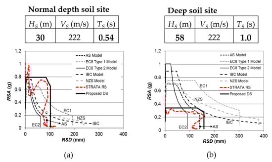 In a case study of a normal stiff soil site of 30 m depth (see Figure 7a) and a deep soil site of 58 m (see Figure 7b), the soil sediments had a common weighted average shear wave velocity of 222 m/s. The soil response spectra in both cases as obtained from the 1D site response analyses using STRATA [] are presented in the format of Acceleration-Displacement Response Spectrum (ADRS) diagrams. It is shown that the proposed design response spectrum (DS) models adopted as Model B in the Malaysia NA to EC8 match the site response analysis results very well [].